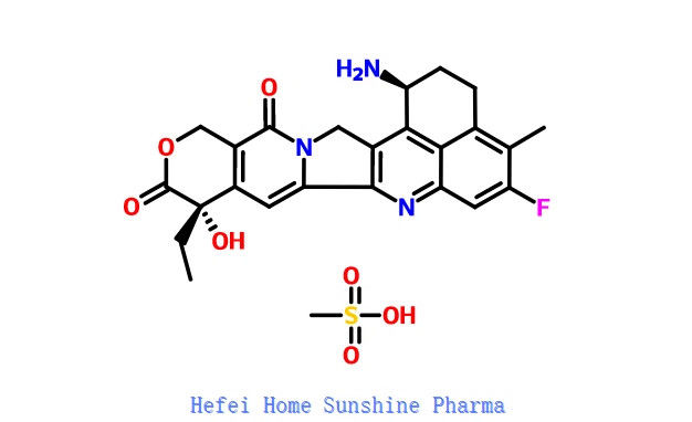 O exatecan mesilato é um derivado semi- sintético, solúvel em água, da camptotecina, com actividade antineoplásica.O exatecan mesilato inibe a actividade da topoisomerase I estabilizando o complexo clivável entre a topoisomerase I e o ADN e inibindo a regeneração das rupturas do ADN., inibindo assim a replicação do ADN e desencadeando a morte celular apoptótica.Este agente não requer activação enzimática e apresenta uma potência superior à da camptotecina e a outros análogos da camptotecina.O exatecan mesilato (DX8951f) é um inibidor da topoisomerase I com um valor IC50 de 2,2 μM (0, 975 μg/ ml) para investigação do cancro.